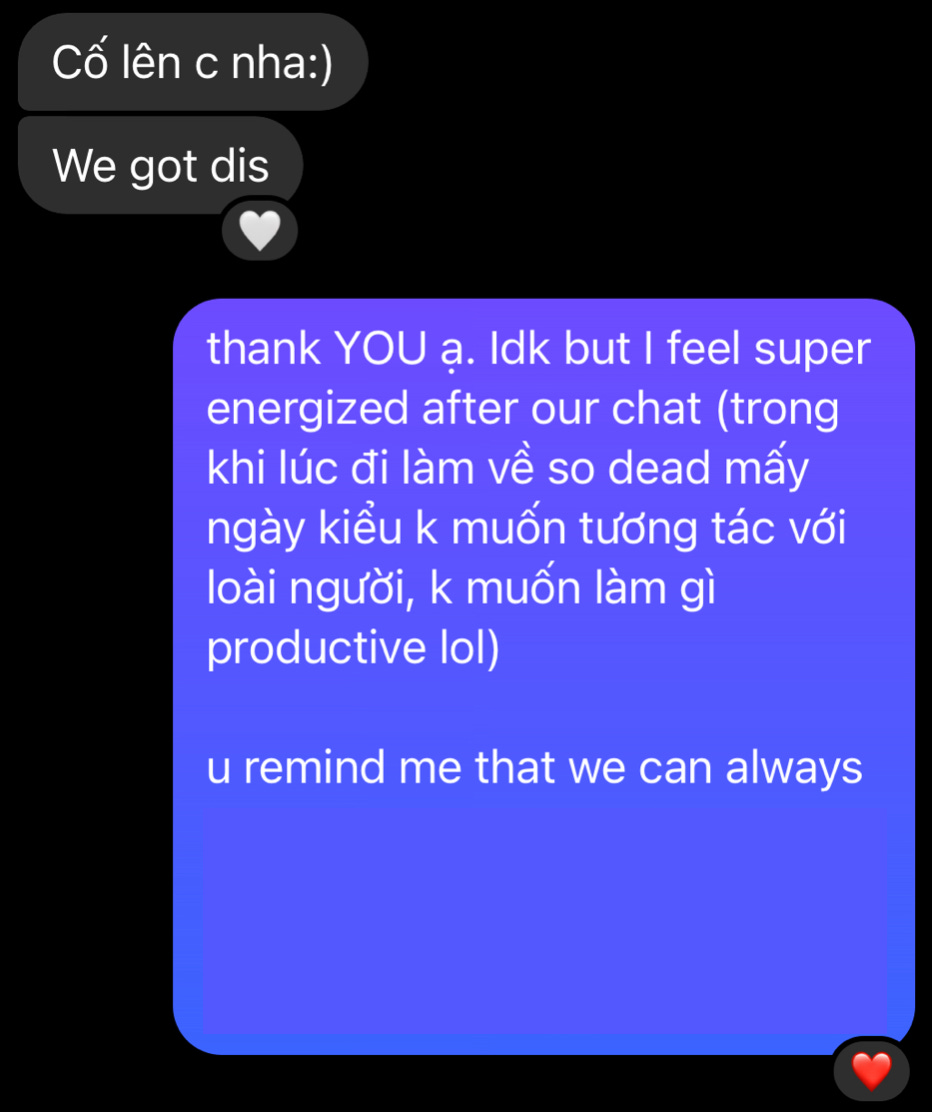 Tôi mong bạn luôn có những kết nối vững chãi để tựa vào. Tôi cũng mong mình chăm sóc bản thân đủ tốt để có năng lượng duy trì và nuôi dưỡng những kết nối quan trọng. Những kết nối thấu tình đạt ý như tách trà hay bát phở ấm nóng dưới trời đông Hà Nội. Những kết nối thúc đẩy tôi, truyền cảm hứng cho tôi tốt hơn mỗi ngày, thách thức tôi khi tôi làm sai, lẫn ôm ấp tôi khi tôi cảm thấy vụn vỡ.